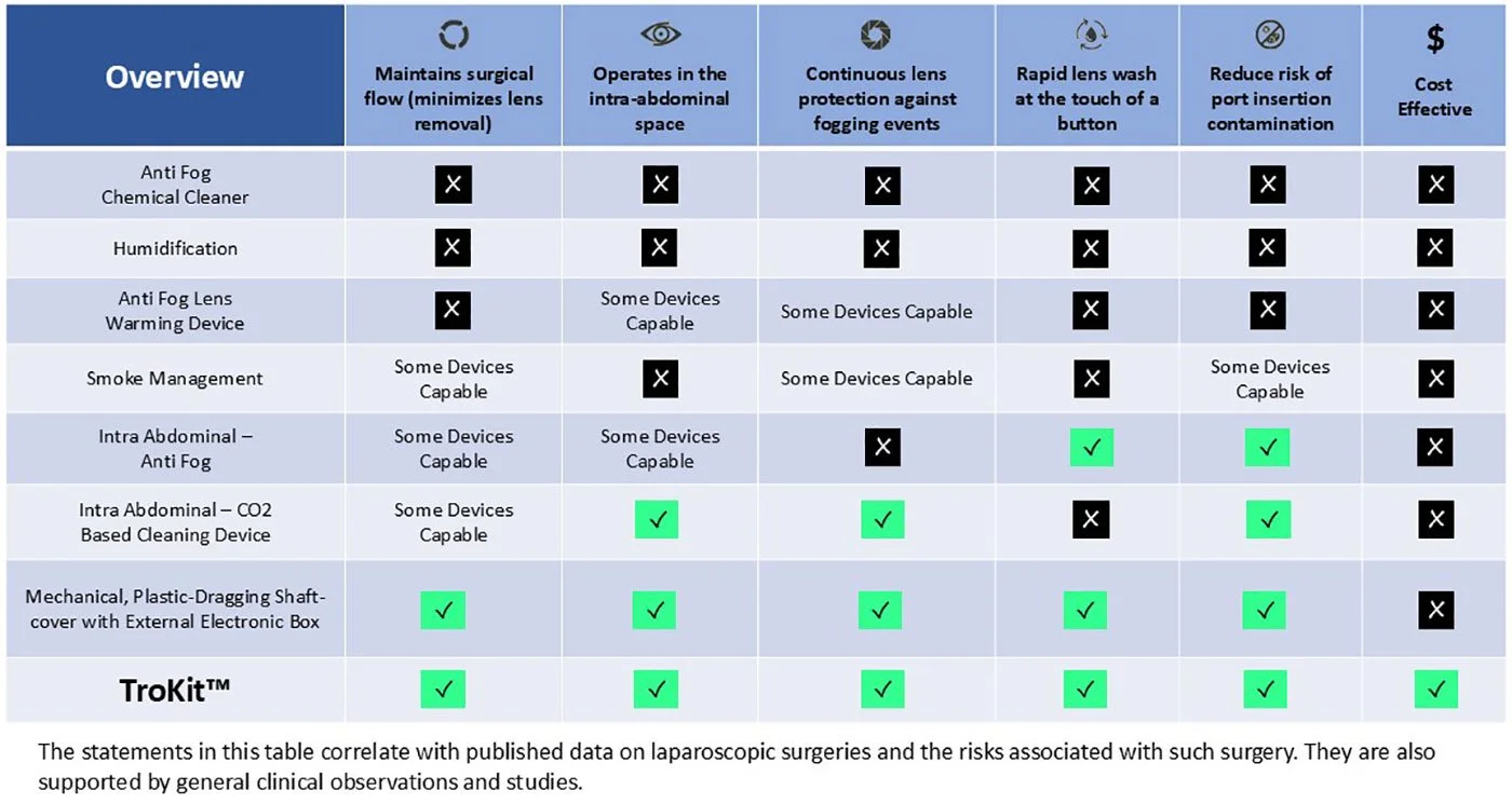 TroCare’s proprietary lens-cleaning TroKit™ is fastened to the end of the trocar and cleans the camera lens from fog, blood, and tissue within the body.